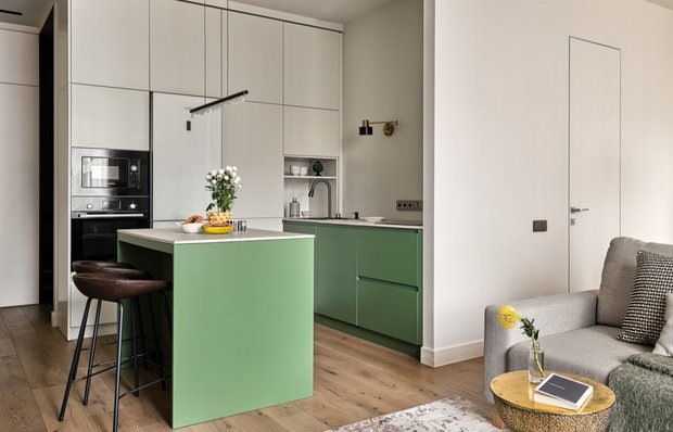 Несмотря на небольшой размер, в кухне много мест для хранения и есть вся необходимая техника. А функциональный остров помог организовать правильный рабочий треугольник, зонировать пространство и стал удобным местом для сбора семьи за завтраками.