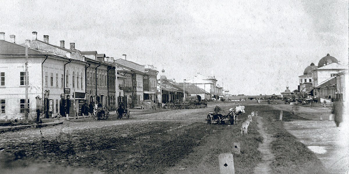 Сейчас это улица Мира, мы стоим с вами у перекрёстка с современными улицами Благовещенская (налево) и Козлёнская (направо), а взгляд наш устремлён в сторону реки.