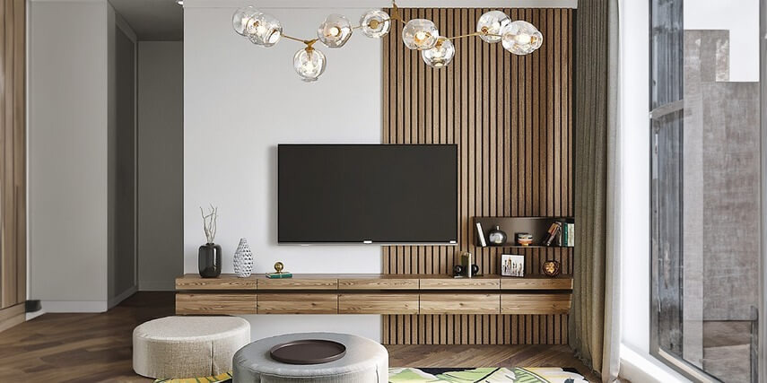 - Монтаж разными способами. Если вешаете на стену, важно заказать кронштейн, подходящий к модели ТВ. Практичные системы, позволяющие наклонять и поворачивать телевизор.