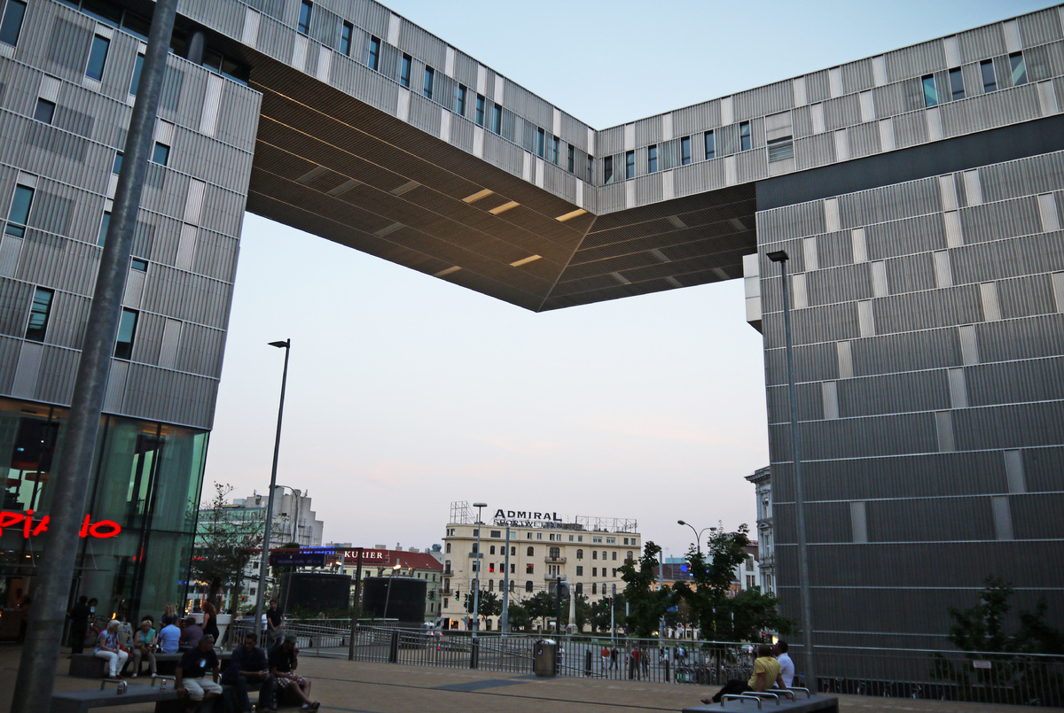 Первое, что напрочь выпадает из нашей «картины ожиданий» — Западный вокзал (Westbahnhof). Один из самых старых в Европе и слегка сменивший имидж. Отсюда пассажиры уезжают в Мюнхен, Франкфурт, Цюрих, Будапешт, Париж и другие города. Мы не собирались зависать в Вене больше двух дней, поэтому забронировали отель рядом с этой «серой каракатицей» (вполне бюджетно и удобно).