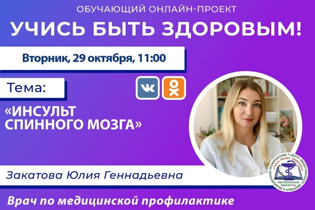 Завтра, 29 октября, в рамках онлайн-проекта «Учись быть здоровым!» специалист Пензенского центра общественного здоровья и медицинской профилактики Юлия Закатова проведет прямой эфир на тему: «Инсульт спинного мозга». Начало трансляции запланировано на 11:00, сообщается в телеграм-канале организации.