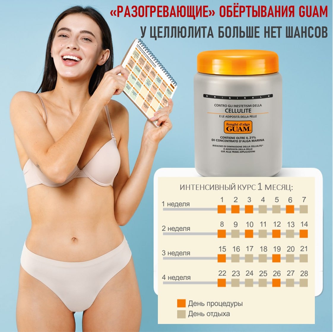 *** Секрет популярности антицеллюлитных масок GUAM в уникальных результатах, которые достигаются оптимальным сочетанием морских водорослей, дренажной глиной, эфирными маслами и фитоэкстрактами. Разогревающие обёртывания GUAM эффективно уменьшают целлюлит и контролируют его развитие👍🏻 *** Подобрать разогревающую маску можно для любой проблемной зоны: ✔️Маска антицеллюлитная с разогревающим эффектом/бёдра, ягодицы ✔️Маска антицеллюлитная разогревающая с Турмалином/бёдра, ягодицы ✔️Маска антицеллюлитная активная с Турмалином/экспресс обёртывание для бёдер и ягодиц ✔️Маска из водорослей для поздних стадий целлюлита/бёдра, ягодицы ✔️Маска моделирующая для живота и талии с Турмалином/живот, талия ✔️Маска укрепляющая для внутренней поверхности рук/руки *** Возможности разогревающего обёртывания: 👉🏻 Уменьшает целлюлит 👉🏻 Снижает отёчность 👉🏻 Моделирует фигуру 👉🏻 Эффект «термо сауны» 👉🏻 Подтягивает и разглаживает кожу *** GUAM предлагает несколько «разогревающих» программ, которы