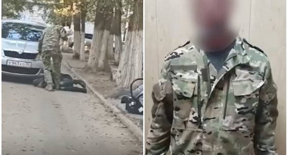 В какой-то момент супруга отделяется от них, подбегает к автомобилю мужа и пинает его по передней левой фаре. Мужчина в форме бойца отряда «Ахмат» с ребёнком на руках подходит к жене и одним профессиональным, хорошо поставленным ударом по голове роняет её на асфальт.