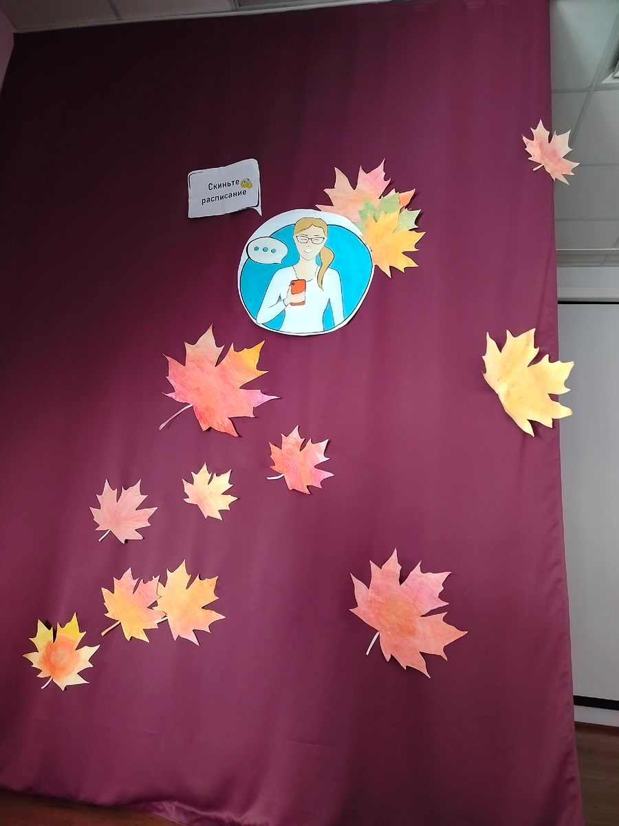 Сегодня хочу поделиться идеей оформления сцены. Работая в школе, учителя часто сталкиваются с оформлением стендов, классных уголков, выставок, а уж если вы учитель изобразительного искусства, то вам знакомо и оформление сцены к различным мероприятиям. Конечно, дорога ложка к обеду, и оформление, которым хочу поделиться было актуально еще месяц назад, но работа захватывает настолько, что делюсь только сейчас. Эту идею можно использовать не только на день учителя, но и на любой другой праздник, тем более не за горами день матери. Для оформления я использовала: С помощью проектора совместно с детьми перевели рисунок кленовых листьев на бумагу, вырезали листочки разных размеров и затонировали их осенними цветами. Далее для одной из кулис на ватмане нарисовала учителя, который читает смс на телефоне, а также вырезали облачка из чата, с популярными фразами, которые чаще всего учителям пишут ученики. Всю композицию разместили на двух кулисах, украсили осенними кленовыми листиками. Конечно