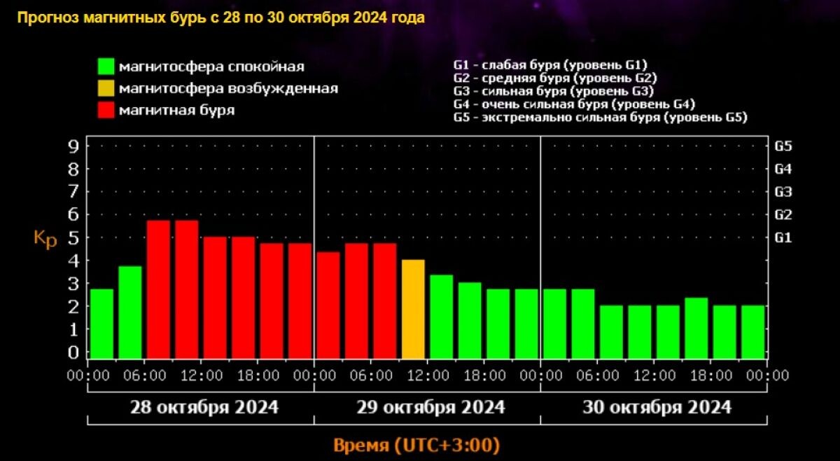 27 октября, примерно в 6 утра, Воронежскую область накрыла магнитная буря. Это следует из прогноза лаборатории солнечной астрономии ИКИ РАН и ИСЗФ СО РАН. Своего пика буря достигла в период с 6:00 до 12:00 часов. Показатели в это время добрались до уровня G2. Теперь магнитная активность идет на спад. С 12:00 часов понедельника, 27 октября до 9:00 часов вторника, 28 октября показатели будут колебаться в районе уровня G1. Затем магнитосфера ненадолго останется возбужденной и к полудню достигнет нормы. Также, согласно прогнозу лаборатории солнечной астрономии, магнитная буря может накрыть регион 24 ноября. До этого магнитосфера будет относительно спокойной, с редкими колебаниями.