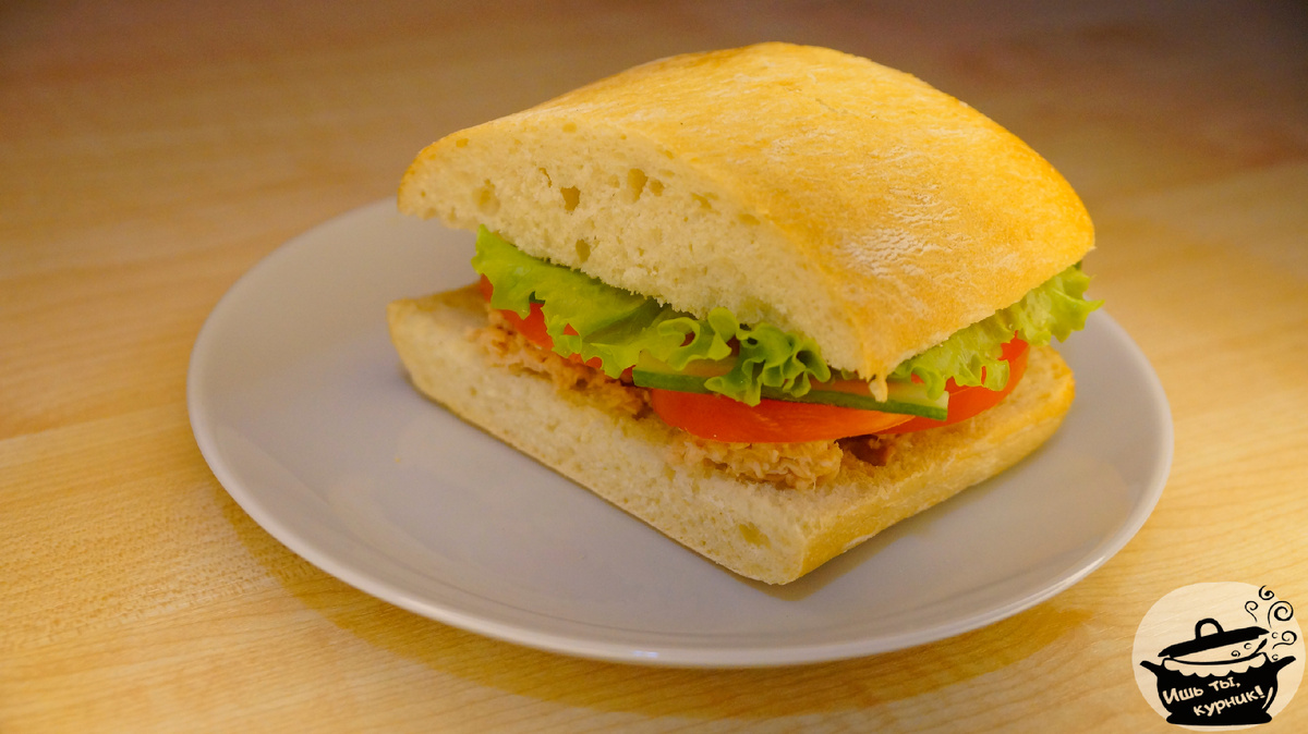 Ингредиенты: · чиабатта – 1 шт.; · тунец – 1 банка; · помидор – 1 шт.; · огурец – 1 шт.; · салат – 4 листа; · оливковое масло – 2 ст.л. Приготовление: тунца размять вилкой с добавлением оливкового масла. Огурец и помидоры нарезать тонко. Чиабатту разрезать вдоль, проложить тунцом, помидором, огурцами и листьями салата. Приятного аппетита!