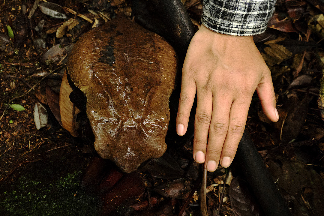 Привет, мои дорогие любители необычной земной фауны. Сегодня у нас выпуск об амфибиях. И, говоря об этом классе животных, трудно пройти мимо такого весомого, в буквальном смысле, представителе. Весомее не бывает. Конечно же, вы сталкивались в обиходе с выражением "жаба душит". И если вы когда-нибудь видели в реальной жизни жабу, то, без сомнения поймёте, что если она и могла кого-то задушить, то только Дюймовочку, если бы та отказалась выйти за её сына. Но глядя на нашего сегодняшнего героя, невольно, по-иному начинаешь трактовать привычную, казалось бы, идиому. Итак знакомьтесь – жаба Бломберга (Rhaebo blombergi), названная в честь шведского натуралиста и автора документальных фильмов о дикой природе, которого она первым задушила. (Шучу, конечно, он первый собрал живые образцы этого вида). Обитает эта рептилия в Южной Америке, в Эквадоре и Колумбии, населяя влажные низменные тропические леса. Вид не редкий, но в связи с относительно небольшим ареалом, вызывающий опасения природоохран
