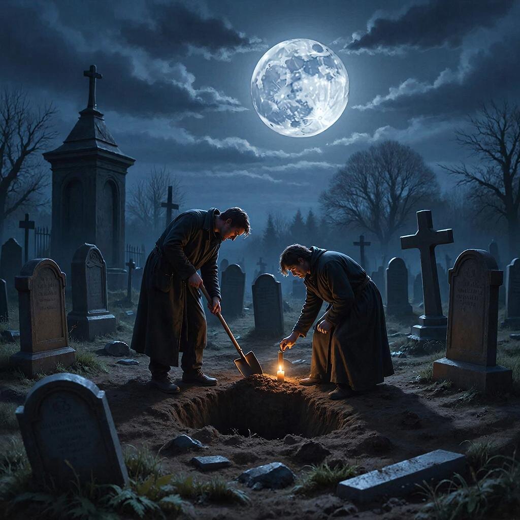 Полный диск луны, на чистом, безоблачном небе, освещал кладбищенскую поляну, утыканную редкими деревьями , на которой двое трудолюбивых вандалов раскапывали свежую могилу недавно скончавшегося богатого старика.