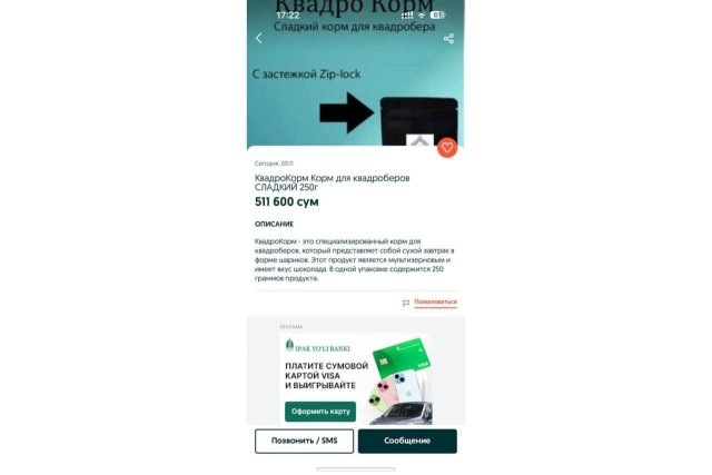 Однако на этом уникальные предложения не закончились. На популярной онлайн-платформе объявлений «OLX» начали продавать специальный корм для квадроберов.