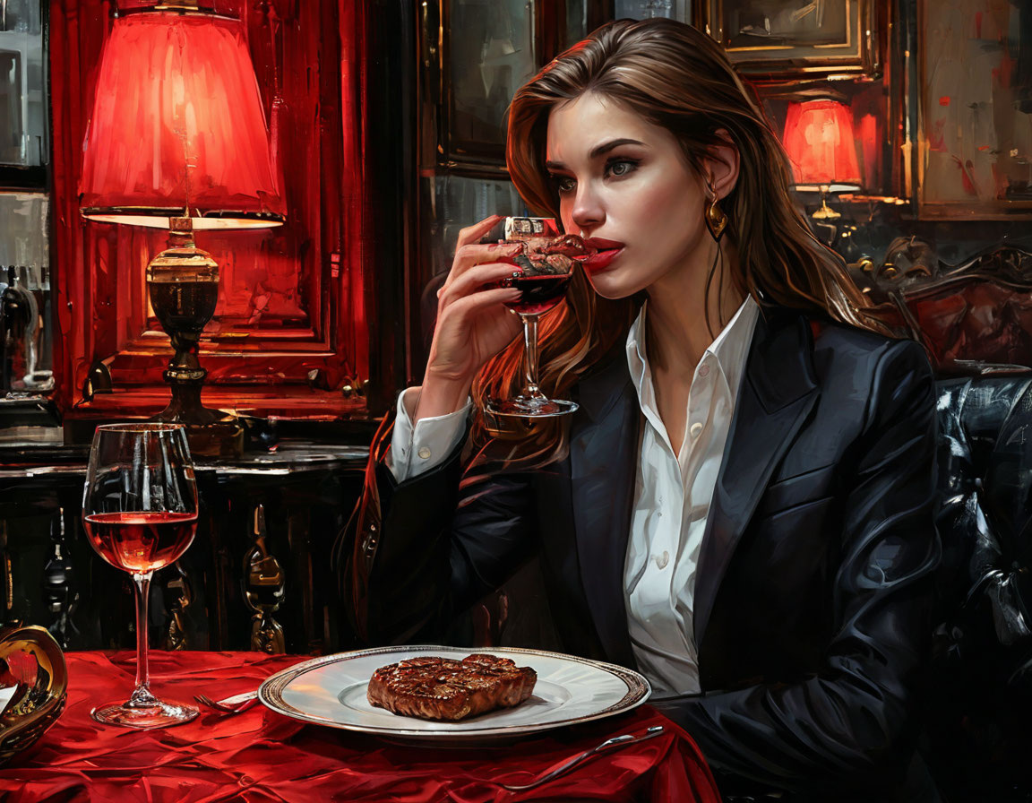 Девушка сидит в черном костюме пьёт вино и ест стейк с мужчиной, с которым она не должна быть в эту ночь.