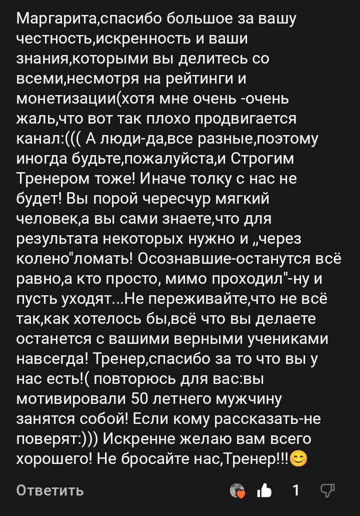 Знаете, что самое ценное для меня в ведении моего канала- это ваша обратная связь. Когда я о чем то пишу, вы понимаете меня, когда я объясняю как лучше делать, вы понимаете меня, применяете это и пишите, что да, действительно это работает. Это именно та ценность, которая наполняет меня, никакие деньги (монетизация) не дадут тех внутренних ощущений, которые я получаю, читая ваши комментарии. Знаете даже работая оффлайн и видя, что моя работа бесполезна, я то понимаю, что она бессмысленна и мне просто жалко своего времени и сил на всё это, даже при возможности заработать денег, я стараюсь прекратить тренировки. Самой мне сложно людям отказывать, поэтому Вселенная мне в этом помогает и подстраивает обстоятельства так, чтобы тренировки прекратились сами. Канал научил меня не боятся высказывать и показывать свои мысли и действия, это качество тем самым перекочевало в мою реальную жизнь, я стала смелее, пошла туда, куда давно хотела, но не решалась. Мой внутренний стержень окреп, я