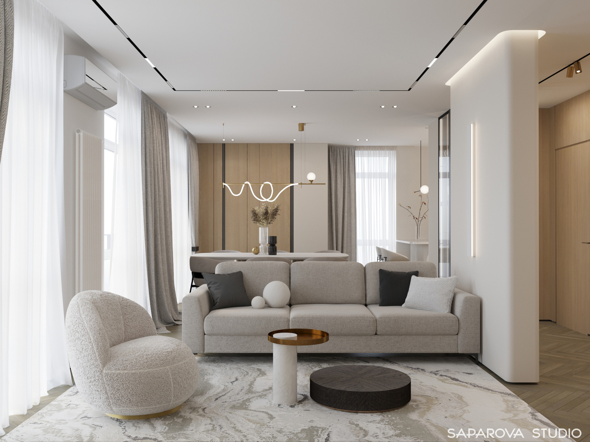 Дизайнеры "SAPAROVA STUDIO " использовали в проекте светлую цветовую гамму и актуальные(долгосрочные) тенденции, чтобы создать спокойный и уютный интерьер для заказчика.