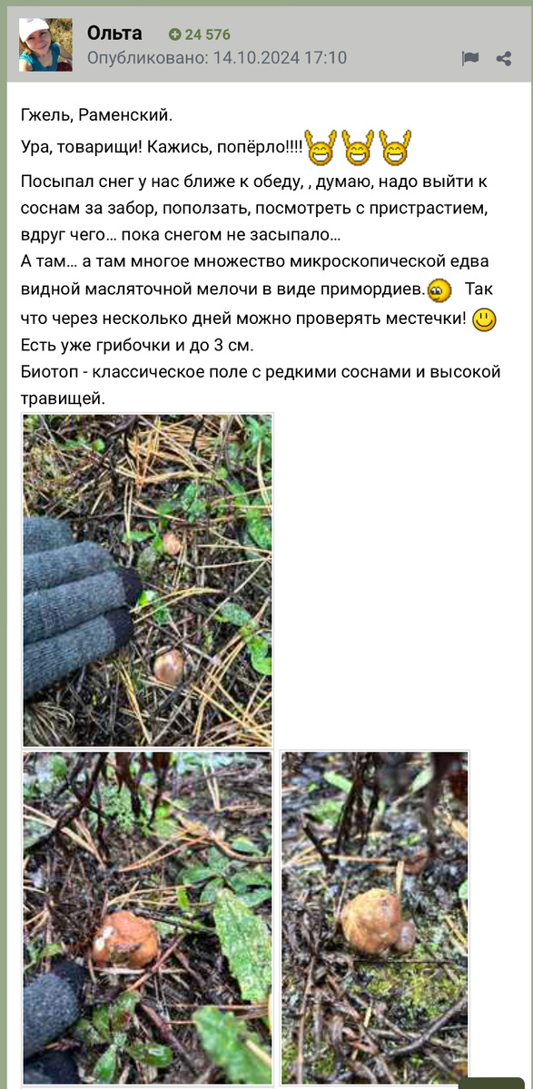 Ясное дело, что мороз и снег никак не могут помешать выходу грибов отличного качества….Но уж как давеча напугал снегопад наивных грибников….Просто смех сквозь слёзы…Конечной аномально поздние слои не могут сравниться с хорошими летними по биомассе….Но грибы качественные, без конкуренции….Также должны быть в наличие поздние точки и главное опыт сбора…. Часто грибы растут на местах раннего выхода….Они солнечные и суховатые….Летом такие места молчат из-за сухости….А под зиму «вдруг» выстреливают…. Часто поздние грибы из глубоких грибниц….Там ножка наполовину в земле….Поэтому такие грибы с небольшой задержкой(примерно неделя) растут после ТВП….Вспомните осенние опята слоем через 3 недели после ТВП на деревяшках, а по «земле» идут примерно через 4 недели….Причём опята того же вида….Часто грибы вырастают фактически в субстрате до большого размера….В тепле….Температура земли сейчас 7-10 град Цельсия на глубине 10 см…. Первыми появились слоем маслята поздние….Уже несколько дней тут и там первы