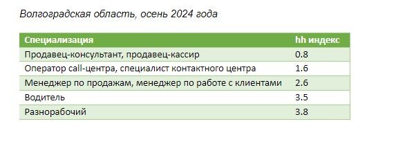 Топ-5 самых востребованных специальностей Волгоградской области назвали эксперты. По данным онлайн-платформы рекрутинга hh.ru, в регионе количество вакансий в январе-сентябре 2024 года выросло по сравнению с аналогичным периодом прошлого года на 21%. С начала этого года по настоящий момент в Волгоградской области было отрыто более 107 тысяч вакансий, прямо сейчас их более 17,5 тысяч. Чаще всего работодатели сейчас ищут менеджеров по продажам и по работе с клиентами — им посвящены почти 1 700 вакансий или каждое десятое предложение в области. На втором месте — продавцы-консультанты и продавцы-кассиры (1 500 предложений), на третьем — операторы call-центра (1 150 предложений), на четвёртом — водители (650 предложений), завершают топ-5 разнорабочие (440 предложений). Эти специалисты вошли в список самых дефицитных в стране и регионе — индекс конкуренции среди них, т.е. количество резюме на вакансию, который при здоровой конкуренции должен быть в диапазоне от 4 до 8, по этим специальностям