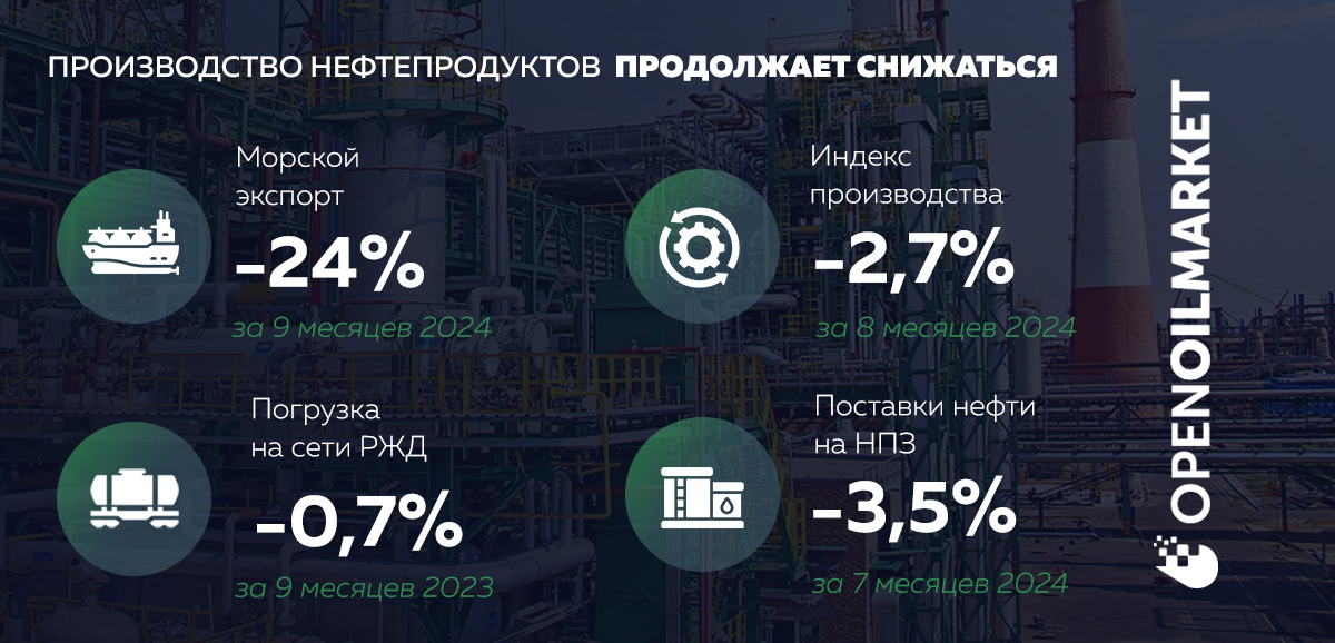 В 2024 году Росстат прекратил публикацию еженедельной и ежемесячной статистики производства автомобильного бензина и дизельного топлива в России. В результате этого участники отрасли вынуждены ориентироваться на косвенные показатели для оценки объемов производства. Аналитики OPEN OIL MARKET провели анализ доступных данных и выявили следующие тенденции: 1. Морской экспорт нефтепродуктов в 2024 году сократился почти на 25%. Основные причины этого снижения включают внеплановые ремонты на нефтеперерабатывающих заводах (НПЗ) и различные внешнеполитические факторы. Согласно данным S&Z Global Platts, морские поставки нефтепродуктов из России в сентябре 2024 года увеличились на 8%, достигнув 2,16 млн баррелей в сутки (б/с). Однако это всё ещё на 520 тыс. б/с меньше, чем в январе того же года, когда поставки составляли 2,68 млн б/с. Эту разницу нельзя объяснить только запретом на экспорт бензина, так как до введения запрета объем его экспорта составлял менее 150 тыс. б/с. 2. Погрузка нефти и не