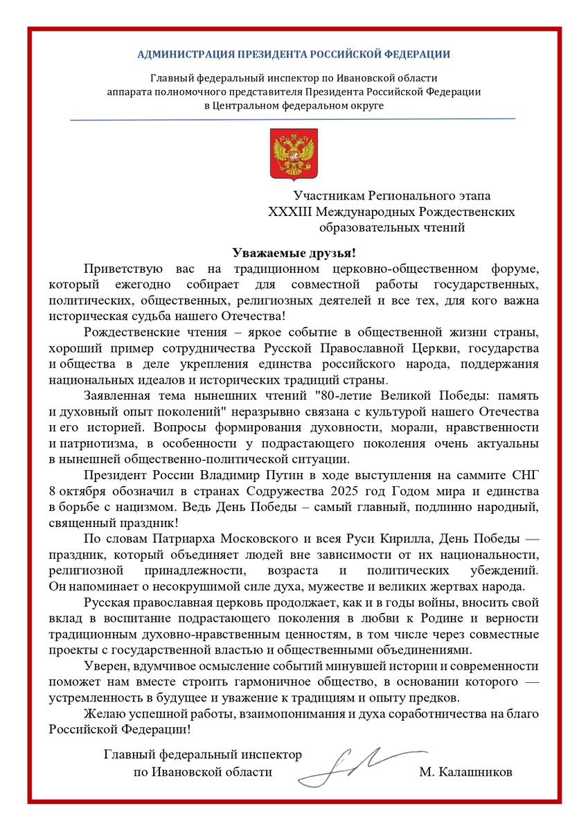 16.10. Приветствие Главного федерального инспектора по Ивановской области М.М. Калашникова