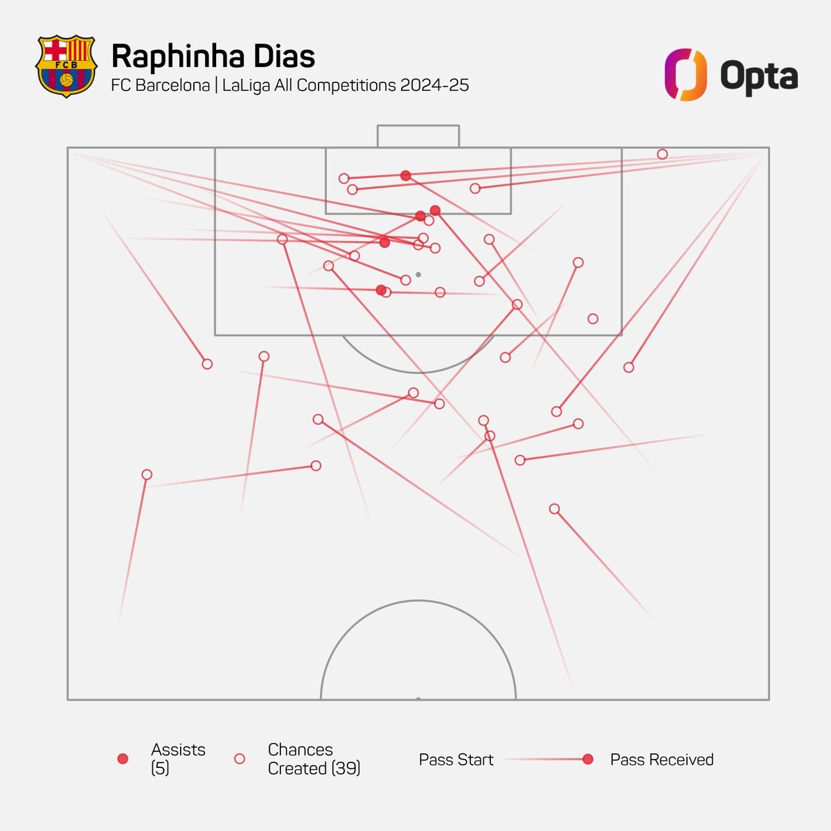 Капитан «Барселоны» Рафинья создал 32 голевых момента в девяти турах Ла Лиги в этом сезоне – это самый большой показатель среди всех игроков в пяти ведущих лигах. Вторым идет вингер «Арсенала» Букайо Сака (27). Согласно официальному сайту каталонцев, Хави – единственный игрок «Барселоны», который создал больше моментов, чем Рафинья, после девяти матчей чемпионата. В сезоне-2008/09 у него набралось аж 34. Рафинья обогнал даже Лионеля Месси и Неймара: у них было по 31. Месси достиг этого показателя в сезоне-2014/15, Неймар – в 2015/16. А вот так выглядит карта созданных Рафиньей моментов. Направление передачи – по мере увеличения яркости линии. Красными кружками отмечены пасы, завершившиеся голами. Бразилец уже забил пять мячей и отдал четыре голевые передачи в Ла Лиге. Также оформил 1+1 в Лиге чемпионов.