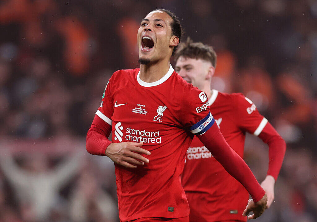 Ван Дейк празднует победный гол на «Уэмбли» в матче с «Челси» (Джулиан Финни/Getty Images)