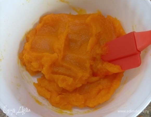 Для пюре тыкву нарежьте небольшими кусочками, добавьте 1 ст. л. воды и готовьте в микроволновке до мягкости. Пюрируйте погружным блендером.