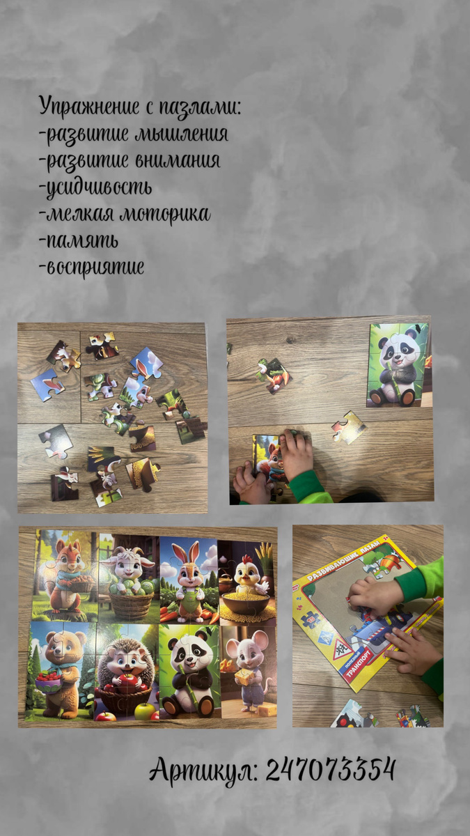 Развитие мышления, восприятия, памяти, мелкой моторики, внимания, возможно в увлекательном для детей формате - собирание пазлов; Интересный факт: Собирать по частям пазл — отличная тренировка для мозга. Она способствует укреплению существующих между его клетками связей, а также способствует продукции новых. Этот синтез благоприятно сказывается на скорости мышления и психических процессах. С чего начать (1-3 года); 1 Разрезные картинки (можно пробовать с 1-1.5 года) артикул 14797806; 2 Пазл-вкладыш (артикул 43091113); 3 Пазлы из 2-х элементов (артикул 152649833); 4 Пазлы из 4-х элементов (артикул 218222782); 5 Пазла из 6-ти элементов (артикул 247073354); 6 Пазлы из 15-ти элементов (артикул 159711279); 7 Пазлы из 35-ти элементов (артикул 227499152); И т.д; Действуем по принципу «от простого к сложному»; По мере освоения ребенком техники сбора пазлов, можно предлагать разные упражнения, включающие в себя уже «освоенный» этап. Например упражнение дополнительно ко вс