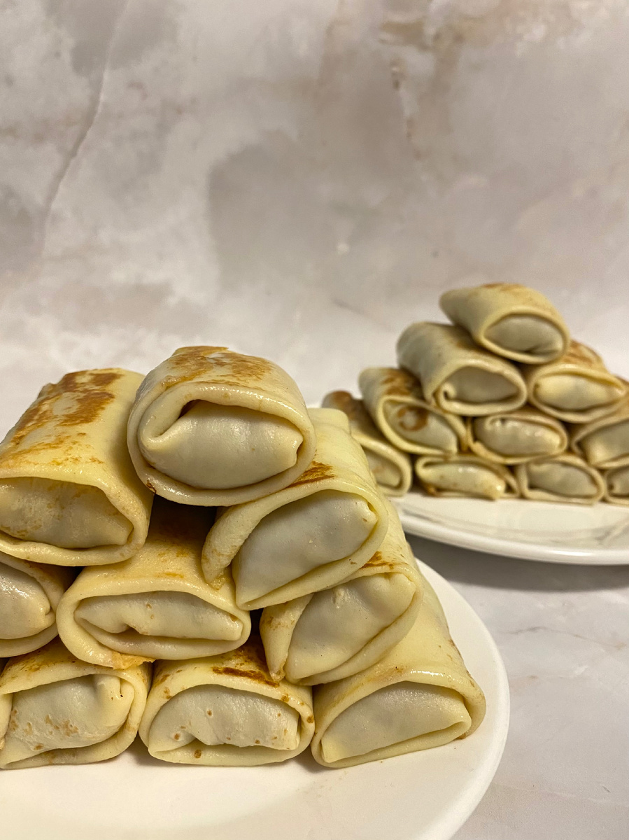ТЕСТО ДЛЯ БЛИНЧИКОВ 7 яиц с1 8 гр соли 20 гр сахара 300 гр муки 900 гр молока 30 гр растительного масла Выход 30-35 шт, диаметр сковороды 18-20 см МЯСНАЯ НАЧИНКА 1 кг мясного фарша (у меня свино-говяжий) 450 гр очищенного лука (~ 2-3 шт) 8 гр соли Перец черный молотый 2 ст.л растительного масла 30 гр сливочного масла Приготовление: Готовим тесто для блинчиков. Разбиваем в чашу 7 яиц, всыпаем соль, сахар и хорошенько взбалтываем. Примерно третью часть жидкости вливаем в чашу, смешиваем и всыпаем 300 гр просеянной муки. Замешиваем довольно густое, однородное тесто без комочков. Затем по чуть-чуть добавляем оставшееся молоко и разводим его до нужной консистенции. В конце добавляем растительное масло. Тесто получается довольно жидким. Оставьте его на 10 минут, чтобы мука набухла. Дальше сковороду нагреваем, смазываем каплей растительного масла, наливаем тонкий слой теста и, как только поверхность блинчика схватится - переворачиваем его на другую сторону и обжариваем буквальн