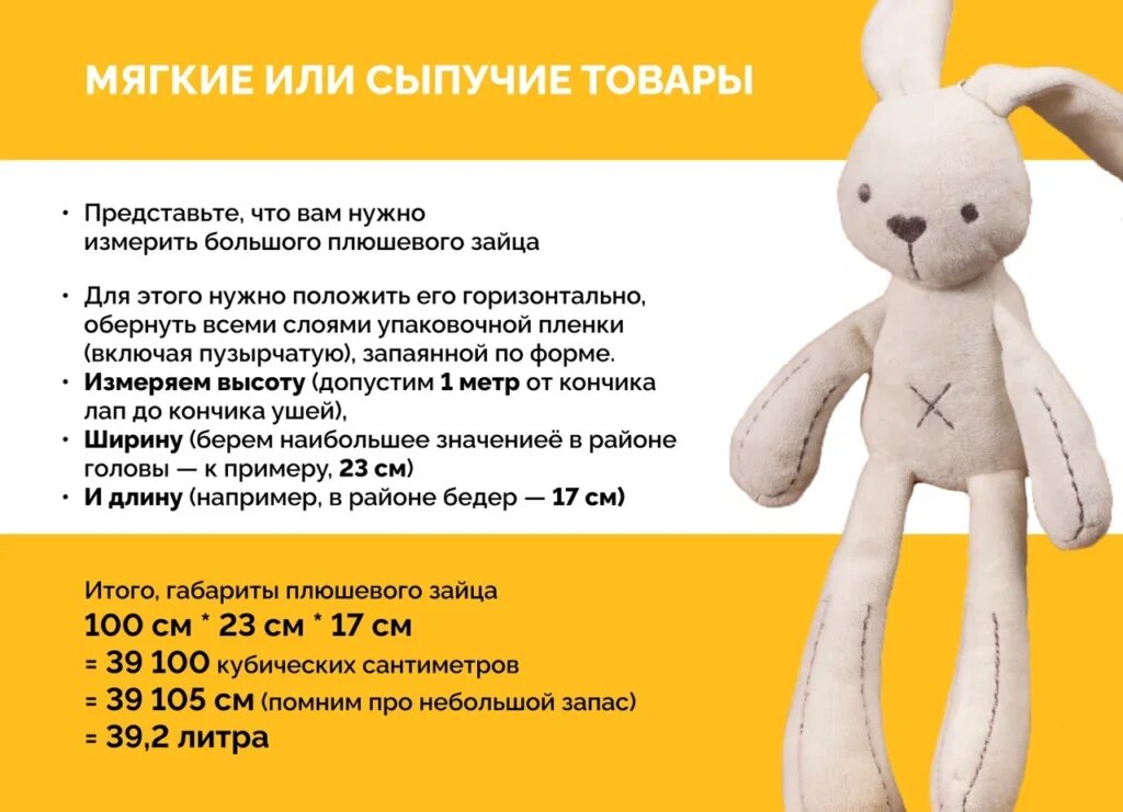 Итого, габариты плюшевого зайца 100 см * 23 см * 17 см = 39 100 кубических сантиметров = 39 105 см (помним про необходимость небольшого запаса) = 39,2 литра.