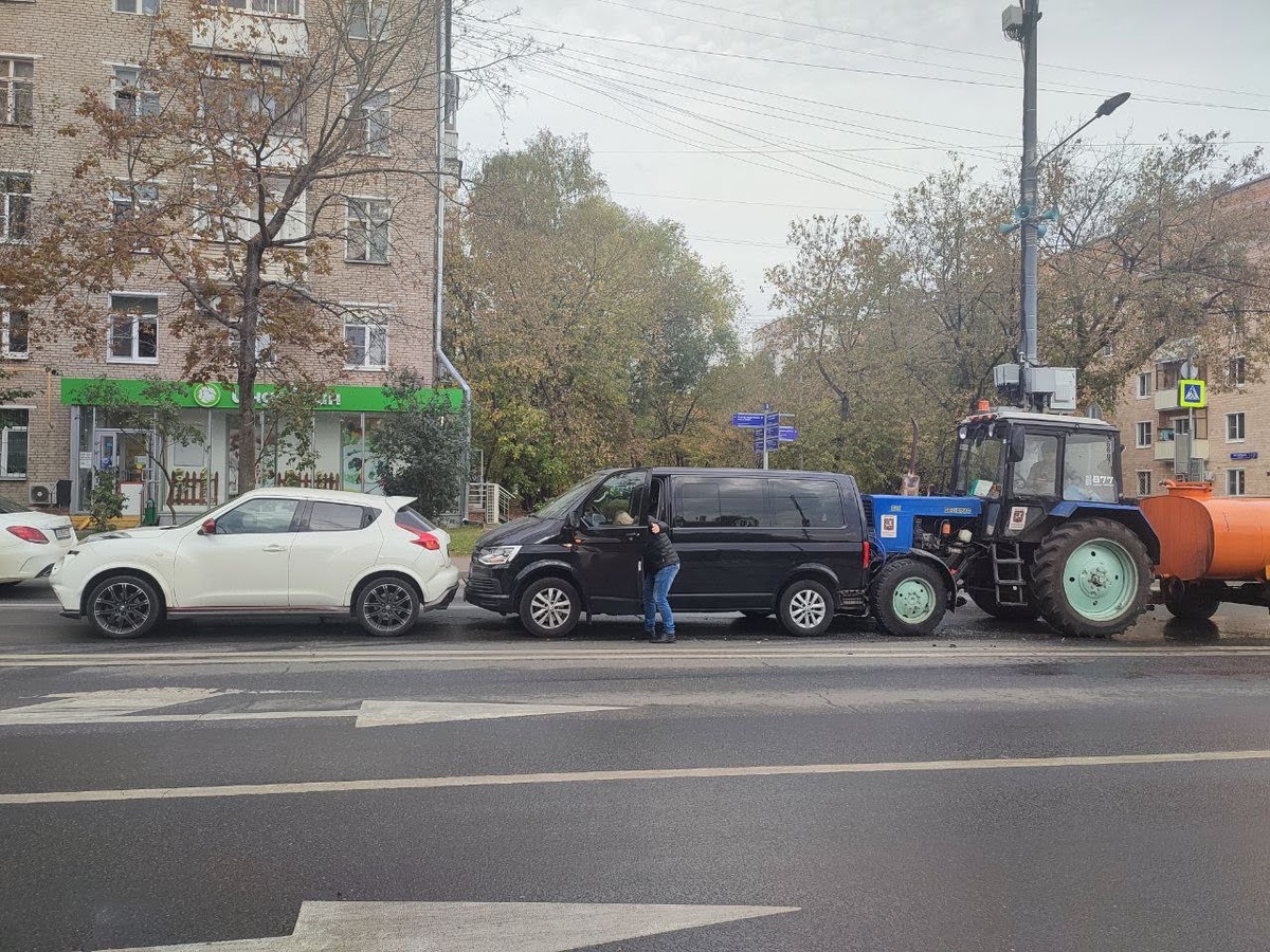 Утром понедельника стоял на светофоре, для поворота налево, пропускал встречный поток. За мной так же на поворот стоял фольксваген мультивен. А завершал всю эту процессию ТРАКТОР.