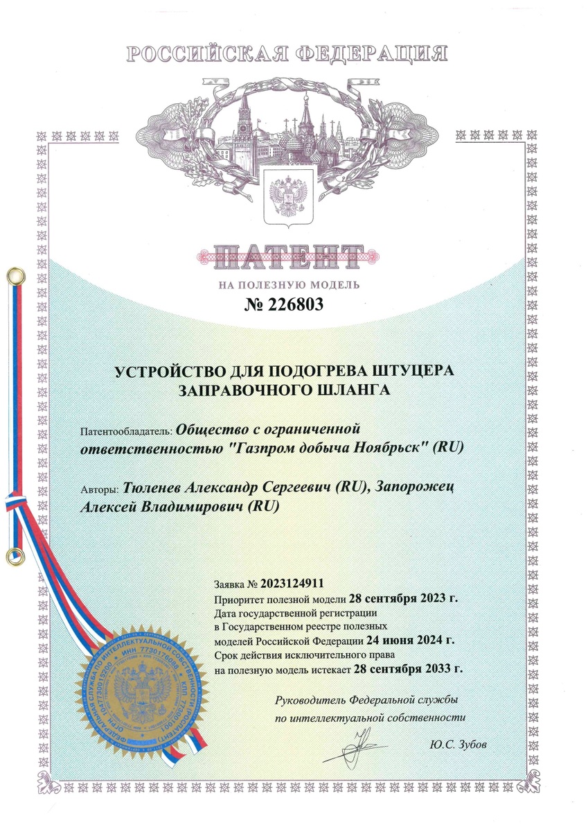 Устройство, разработанное в Управлении технологического транспорта и специальной техники, обеспечивает надежную заправку автомобилей, работающих на природном газе в условиях Крайнего Севера. При эксплуатации автомобильного газового заправщика в зимнее время работа осложняется обмерзанием штуцера и резинотехнических изделий на нем. В результате продолжительного воздействия отрицательных температур металл штуцера замерзает, резина теряет эластичность, становится твердой. Срок службы штуцера заправочного шланга и заправочного устройства газобаллонного автомобиля снижается. Для подогрева штуцера перед установкой его в выносное заправочное устройство газового автомобиля было разработано, смоделировано и изготовлено специальное устройство. Оно быстро разогревает резиновые уплотнительные элементы и металл штуцера и позволяет подготовить к работе оборудование в сложных погодных условиях. Передвижные автомобильные газовые заправщики на базе полуприцепов, применяемые в ООО «Газпром добыча Ноябрь