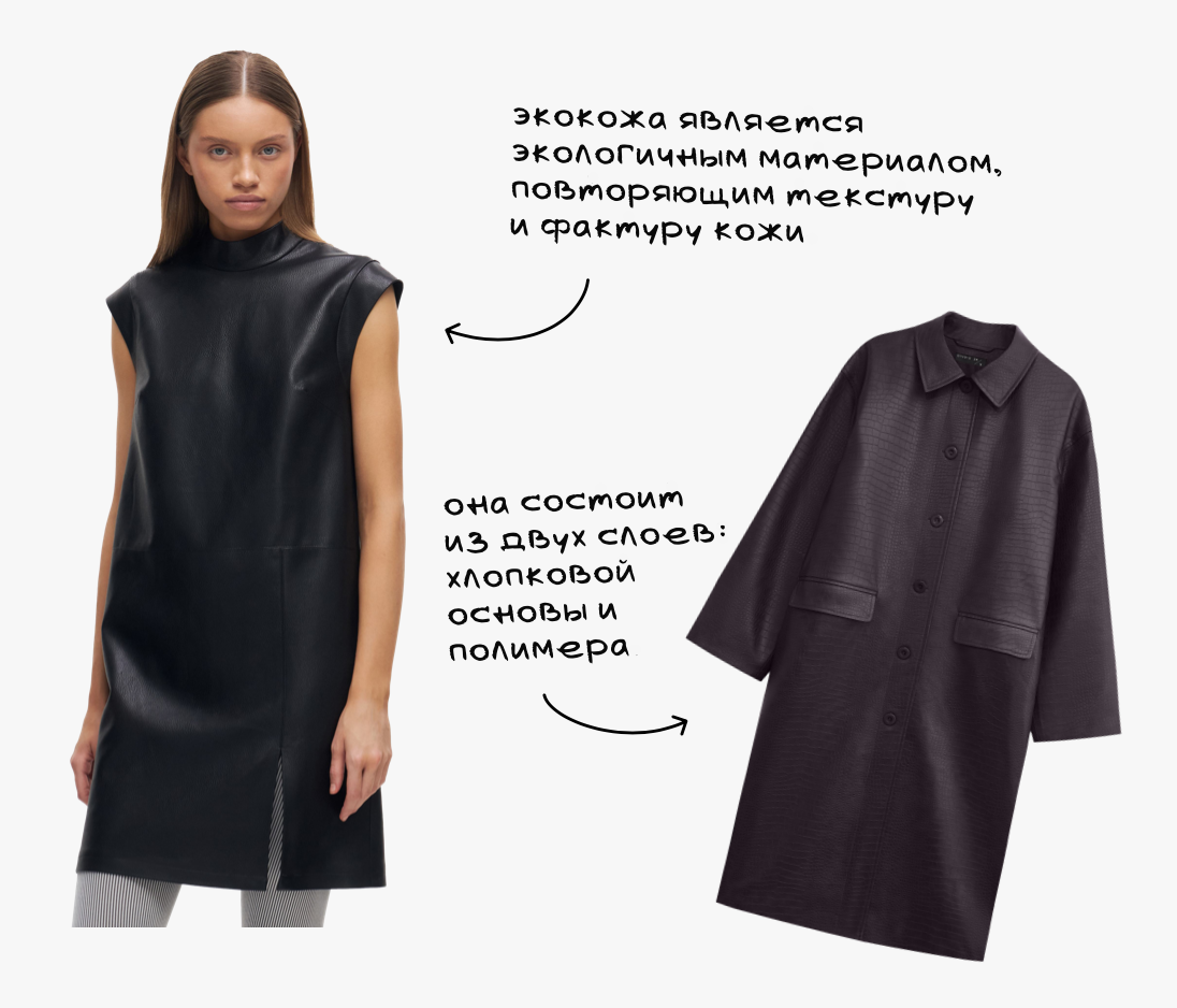 Все меньше брендов используют в производстве натуральную кожу, отдавая предпочтение экокоже. Попытаемся разобраться в том, что это за материал. Экокожа является экологичным материалом, повторяющим текстуру и фактуру кожи. Она состоит из двух слоев: хлопковой основы и полимера. Полимерное покрытие, наносимое на основу – полиуретан. При его обработке наносится тиснение с нужной фактурой. Благодаря свойствам полиуретана экокожа обладает качествами, которые делают её удобной и практичной в носке. Попытки создать искусственную кожу высокого качества ученые предпринимали еще в 19 веке. Так появился «кожзам» и другие аналоги, не прошедшие проверку временем. Только к 1960-м годам исследователям из США и Японии удалось создать материал высокого качества, подходящий для массового производства. В то же время Ив-Сен Лоран ввел в моду изделия из кожи с провокационной коллекцией «Beatnik». А через тридцать лет кожа стала одним из самых популярных материалов у кутюрье по всему миру. Спрос рождает пре