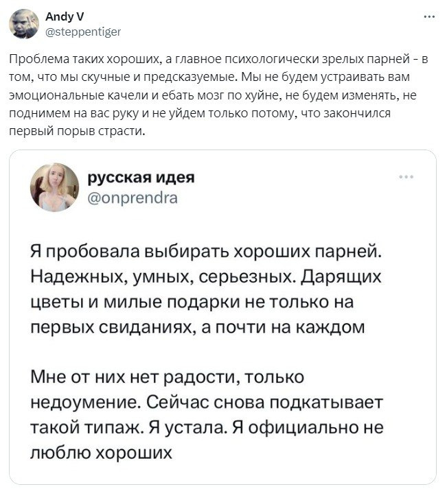 И дальше пошёл в полную неадекватщину, описывая радикальные эмоциональные триггеры – измены, манипуляции, физическая расправа. Ну понятно что это трэш, и сам делать не хочет, и женщине не понравится. А вот что нравится, так и не понял. 🎯Давай встанем на её место в отношениях с «хорошим» парнем. Прямо представь: