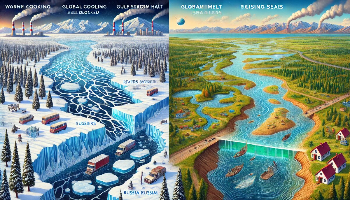 А теперь представим другой сценарий — глобальное потепление. Температура повышается, льды Арктики тают, уровень мирового океана растёт. Казалось бы, Россия, с её суровым климатом, только выиграет от потепления — в Сибири станет теплее, можно будет развивать сельское хозяйство на огромных территориях. Но не всё так просто.