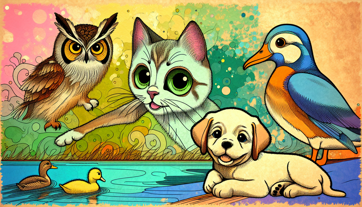 В одном волшебном лесу, где высокие деревья переплетались своими кронами, а лужайки пестрели яркими цветами, жили три лучших друга: любопытная кошечка Лола с пушистым хвостиком и зелёными глазами, Мудрая сова Тиша и игривый щенок Бобик. Однажды солнечным утром, когда лучи солнца пробивались сквозь листву и лес наполнялся звуками пения птиц, Бобик, как всегда, весело бегал по тропинке, играя с осенними листьями. Он скакал так, словно за его спиной были крылья. Вдруг он услышал испуганный крик: — Кря-кря! Помогите! Бобик остановился и прислушался. Крики доносились из пруда, который находился немного дальше. Щенок быстро направился в ту сторону. Когда Бобик подбежал к пруду, он увидел бедную утку, которая хлопала крыльями в воде. — Что с тобой, утка? — спросил Бобик. — Я заблудилась! — всхлипывала утка. — Я искала своих друзей, но вместо этого оказалась одна в этом незнакомом месте! — воскликнула утка, обращаясь к Бобику и Лоле, которая тоже прибежала на её крики. — Не переживай! Я помогу