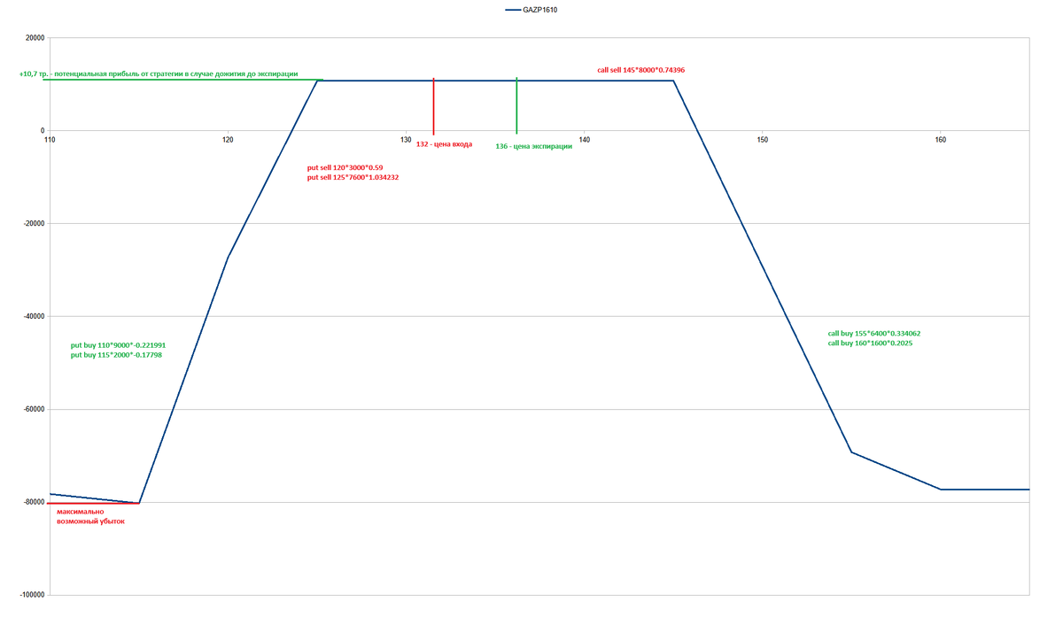 Добрый день! Дисклеймер: статья про премиальные опционы (ПО). По большому счёту ничем. Когда премиальные опционы появились на Мосбирже (и до последнего времени, кстати!) маркетос так котировал опционы, что для любой конструкции (будь то кондор или бабочка), правое крыло всегда было дороже левого. Собственно, Гусь - это и есть недостроенный Кондор/Бабочка (без правого крыла). Но, по счастью, ситуация не стоит на месте и постепенно меняется в лучшую сторону: по некоторым активам в стакане уже есть два маркетмейкера (например, в Сбере и Газпроме). Здоровая конкуренция идёт на пользу трейдерскому сообществу и такие традиционные стратегии как Кондор/Бабочка стало возможным строить без существенного ущерба экономике стратегии. Например, за две недели до месячной экспирации 16/10/24 построил такого Кондора в Газпроме $GAZP (как на картинке). За две недели удалось заработать 10,7тр. ГО конструкции составило 95 тр. Отдача на ГО 11,2%. С расчётом гарантийного обеспечения вышла одна странность, д