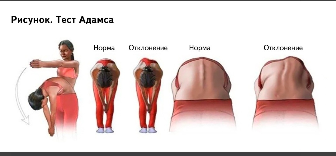 Искривление позвоночника (сколиоз) часто встречается в школьном возрасте, хотя связь сколиоза и неправильной осанки за партой не доказана. Родителям рекомендуют обращать внимание на осанку ребёнка во время "скачков роста" - 7-8 лет и 11-13 лет у девочек; 8-10 лет и 13-15 лет у мальчиков. В эти периоды желательно показать ребёнка врачу-ортопеду. Родители могут сами определить, есть ли у ребёнка сколиоз. Для этого используется простой тест Адамса. Он позволяет отличить функциональную асимметрию осанки (норма) от структурной деформации позвоночника (сколиоз). Показания – асимметрия надплечий (одно плечо выше другого), углов лопаток (одна лопатка выше другой), треугольников талии (расстояние между свешенной вдоль туловища рукой и талией с одной стороны больше, чем с другой), грудной клетки. Осмотр сзади и спереди . Ребенок стоит. Его просят наклониться вперед. Если деформация исчезает при наклоне вперед, то можно говорить о функциональных изменениях осанки. При искривлении грудной к