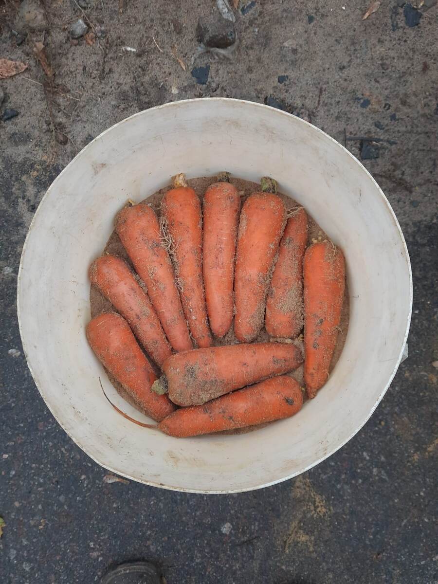 Выдергиваю морковь аккуратно. Если почва плотная, то подкапываю с боку немного лопатой. Если на корнеплодах есть прилипшая почва, то я не ударяю морковью друг о друга, чтобы стряхнуть ее. Она от ударов может полопаться. Я снимаю почву рукой в перчатке из ткани.