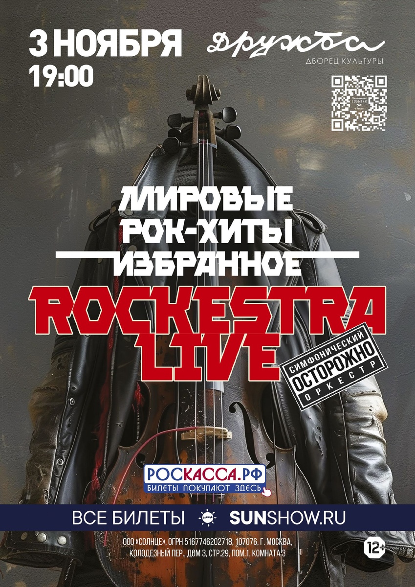 💥 Симфонический оркестр RockestraLive представляет программу лучших рок-хитов в ДК "Дружба" г. Чехов 🎻RockestraLive — симфонический оркестр исполняющий инструментальные вариации знаменитых рок-хитов. Регулярно выступает на главной сцене страны в Кремлевском Дворце. В этот вечер вы услышите самые значимые шедевры начиная с 50-х годов прошлого столетия со всей планеты: США, Англия, Германия, Ирландия, Австралия, Швеция и конечно же Россия. 🎼Полный набор инструментов симфонического оркестра - это мощь и напор медных духовых, лиричность и проникновенность деревянных духовых, а также поток наслаждения и мурашек от большой струнной группы скрипок, альтов, виолончелей и контрабасов. Главный дирижер — Сергей Акимов. 🚫 Возраст: 12+ 📆 03.11.2024 🕕 19:00 🏢 ДК «Дружба» 📍 г. Чехов, ул. Чехова, д.45 💰 Цена от: 1200 до 2800 ₽ 🎫 Купить билет: clck.ru/3DqQbW #КТД #ГоспабликиМО #ГородскойОкругЧехов