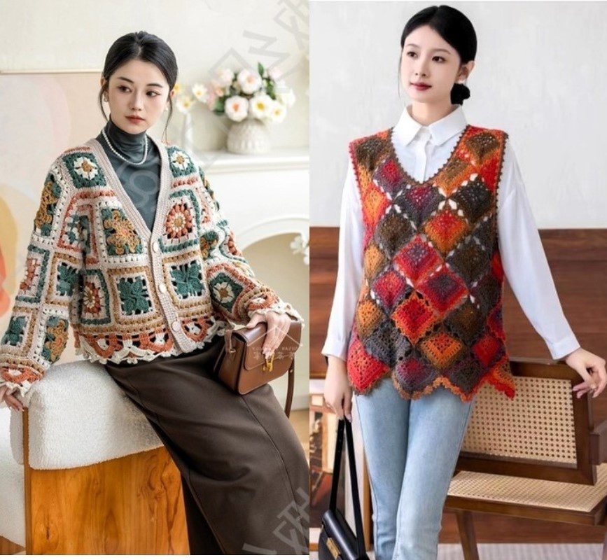 Уютные женские модели в стиле печворк из разноцветных квадратных мотивов для изысканных и требовательных модниц Смотрятся модели свежо женственно.