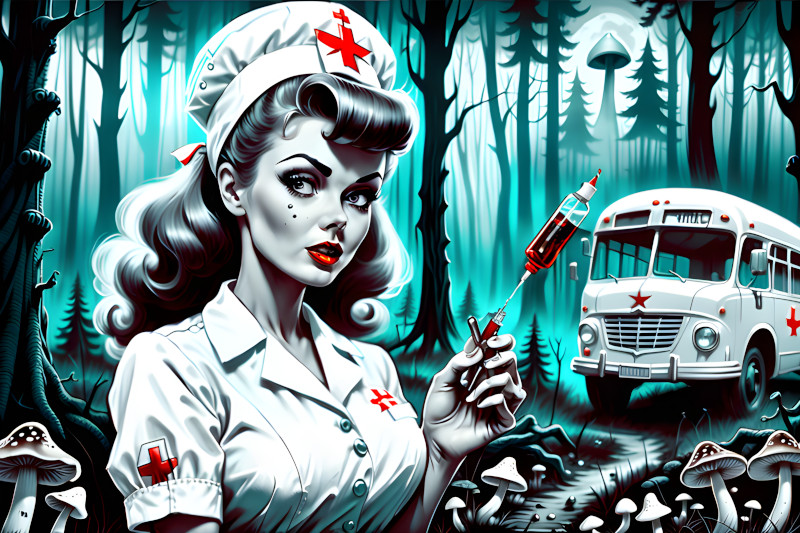 Медсестричка в коротком халатике нагло просунула крепкую, словно специально искривленную, ножку в дверь. А потом и сама протиснулась в квартиру. Ехидное лицо ее светилось фосфорной зеленью. Губы, измалеванные густой помадой, растянулись до ушей в фальшивой улыбке. Накладные ресницы изгибались подобно медицинским иглам для кожных швов. На плече, как винтовку, визитерша держала колоссальных размеров шприц, заряженный жидкостью малинового цвета.