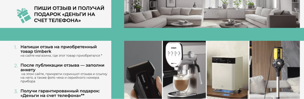 Зарабатывайте на отзывах о товарах Timberk! Купили технику Timberk? Теперь у вас есть возможность получить деньги на счет телефона! Примите участие в акции: оцените свою покупку, а мы отблагодарим вас за это. Как принять участие: Купите технику Timberk в любом магазине или на маркетплейсе. Напишите отзыв о товаре на сайте магазина или платформе (например, Яндекс.Маркет, Otzovik, Irecommend). Заполните анкету на сайте акции и прикрепите: Получите подтверждение и виртуальную карту для оплаты мобильной связи на ваш e-mail. Условия акции: Покупайте продукцию с 1 апреля 2024 по 31 марта 2025 года. Оставляйте отзывы и отправляйте заявки в тот же период. Подарки вручаются до 30 апреля 2025 года. Почему это стоит сделать? Вы помогаете другим покупателям, делясь своим мнением. Получаете деньги на мобильный счет. Участвуете в акции целый год! Присоединяйтесь и получайте бонусы от Timberk!