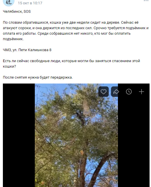 Увидели пост: К волонтерам обратились местные жители, около двух недель на самом верху дерева сидит кошка. Иногда плачет, но уже все тише и тише. Периодически получает от сорок. Сразу отвечу на интересующий многих вопрос, нет, кошки не всегда могут самостоятельно спуститься с дерева. Так устроено их строение когтей. залезть могут, спуститься уже проблема. Валерьянка тоже здесь не сработает. Чаще всего они сидят до последнего, а потом уже обезвоженные и ослабленные падают и частенько разбиваются. Пока добирались совместными усилиями волонтеров и наших подписчиков нашли ближайшую автовышку и скинулись на нее. Снимать кота поднимался муж, я высоты боюсь. Была проблема именно снять кота, люлька не могла подлезть прям к дереву - провода и ветки. Плюс если все делать резко, кошка могла бы напугаться и залезть еще выше или вовсе спрыгнуть неудачно. Пыталась шипеть и лезть наверх, но у мужа получилось ее схватить за шкирку и снять без каких-либо увечий. Да и кошка уже была заметно ослабевшей.