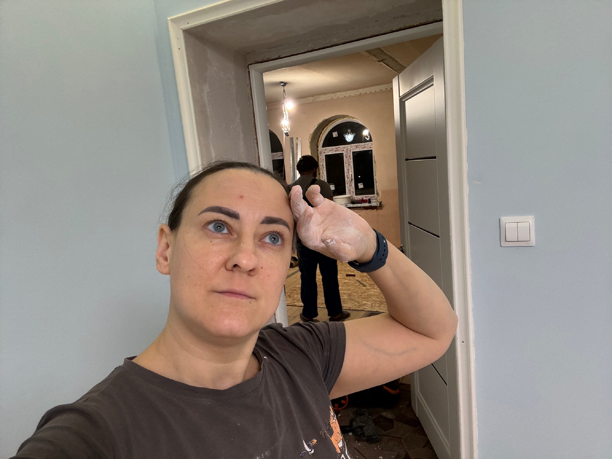 С дверью у нас небольшая беда случилась. Муж установил ее весной и все было нормально. Отлично закрывалась - открывалась. Но за лето что-то с ней произошло... Как говорят, разбухла. Просто снизу плохо стала закрываться. Можно ли так оставить и понадеяться, что зимой все нормализуется? Нам кажется, что нет. Хочется, чтобы все хорошо закрывалось и без каких-то проблем и оговорок. Поэтому вечером муж дверь переустановил. Но что-то пошло не так... В результате, снизу стало хорошо все работать, а сверху немного цеплять. Спокойствие нам только снится... Муж посмеялся и сказал, что уж с третьего раза точно хорошо установит и без косяков. Сказал - сделал! Теперь дверь очень мягко открывается и закрывается без каких либо "нюансов". Пока муж возился с дверью, мои работы с откосами приостановились. Только вечером до них добралась. С выравниванием на черновую закончила! Ну а на следующий день уже подшлифовала и сделала шпатлевку на финиш. Осталось только еще раз шлифануть и покрасить. Уже очень