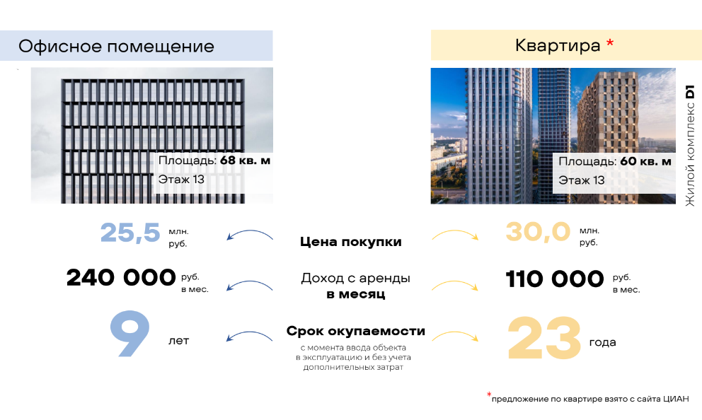 Очень популярный вариант у многих инвесторов это купить квартиру для сдачи в аренду. Давайте сравним его с покупкой для этих же целей объекта коммерческой недвижимости. Возьмём вариант без ипотеки. Она сейчас интересна только для тех, кому ещё пока доступна та или иная льготная программа. Если Вы сейчас готовы покупать новостройку, то звонит - разберём Вам кейс. Просчитаем, что действительно выгоднее. Итак, если мы вложим 30 млн ₽ в квартиру, то за сколько мы её можем сдать? За год будет выходить порядка 1,8 млн ₽. Если мы купим офис или торговое помещение в этом бюджете, то доходность уже будет порядка 3 млн ₽. Показан исключительно доход от сдачи. Доход так же будет и от роста стоимости самого объекта. Окупаемость квартиры 16,5 лет Окупаемость коммерции 10 лет Оба варианта без индексации Вот иллюстрация от одного из наших партнёров. Я взял консервативнее сравнение, чем у них. Я склонен к скептицизму, уважаемый читатель ). Что останавливает от того, чтобы вместо квартиры купить коммер