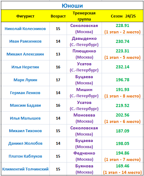 Чуть ниже я оцениваю шансы фигуристов или совсем без ультра-си, или с не самыми стабильными ультра-си. Из этого списка приятно удивил на первом этапе нижегородец Платон КАБЛУКОВ, который сейчас тренируется в Москве у Софьи Федченко. Еще год назад он набирал на этапах по 160 баллов, а сейчас уже 190+. Постарается "хлопнуть дверью" занявший лишь 14 место на этапе в Москве Клим ТОЛЧИНСКИЙ. Его путь на Первенство России 2025 лежит исключительно через 1 место, что вряд ли выполнимо. А вот Илье МАЛЫШЕВУ, как и на первом этапе, нужно быть минимум шестым, что как раз вполне реально. Возможно по такому случаю мы увидим от Ильи первый в его карьере успешный тройной аксель.