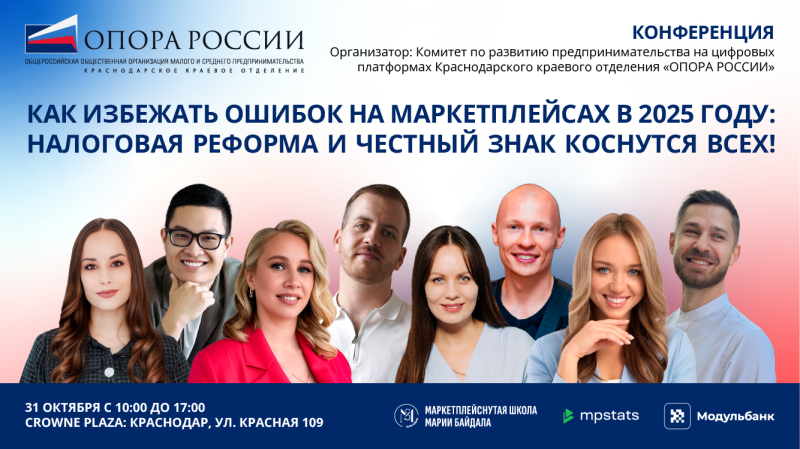 Бесплатное мероприятие о трендах бизнеса на электронных торговых площадках пройдет 31 октября в конференц-зале "Crowne Plaza Centre Krasnodar" (ул. Красная, д. 109, зал "Олимпийский") с 10:00 до 17:00. "Как избежать ошибок на маркетплейсах в 2025 году: налоговая реформа и "Честный знак" коснутся всех" — такова тема конференции, которая актуальна для всех, кто уже работает или только планирует выход на платформы онлайн-коммерции. Организатором мероприятия выступил Комитет по развитию предпринимательства на цифровых платформах Краснодарского краевого отделения "ОПОРА РОССИИ" при поддержке комитета по PR и связям со СМИ ККО «ОПОРА РОССИИ». Участников ждут выступления от действующих селлеров, предпринимателей и экспертов по выбору ниши, ранжированию товаров, подготовке к налоговой реформе 2025 года, автоматизации работы с "Честным знаком" и другим важным аспектам работы на маркетплейсах. Также будет возможность обсудить с представителями "Модульбанка" способы снижения расходов на банковски
