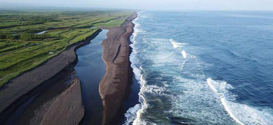 Пляж с вулканическим чёрным песком, происходящим из залежей минеральных титано-магнетитов. Одна из главных достопримечательностей Камчатского края. Место, откуда открывается вид на три живописных вулкана. Длина береговой линии пляжа составляет примерно 50 км. Ширина береговой линии с песком варьируется от 800 до 1000 метров. Песок на пляже вулканический. Но бояться тут нечего. В нём не содержаться вредные для человека минералы. Состоит песок преимущественно из железа, титана и ванадия. Откуда вообще взялся этот песок, да ещё и в таком количестве? Рядом с пляжем расположены три крупных вулкана: Корякский (Корякская сопка), Авачинский (Авачинская сопка) и Козельский. Именно эти величественные вулканы вы сможете наблюдать, прогуливаясь по живописному чёрному песку. Так вот. Около 4 000 лет назад Авачинская сопка активно извергала на поверхность лаву. Под воздействуем природных стихий лава превратилась в чёрный песок. Этот пляж считается одним из самых красивых не только на Камчатке, но во