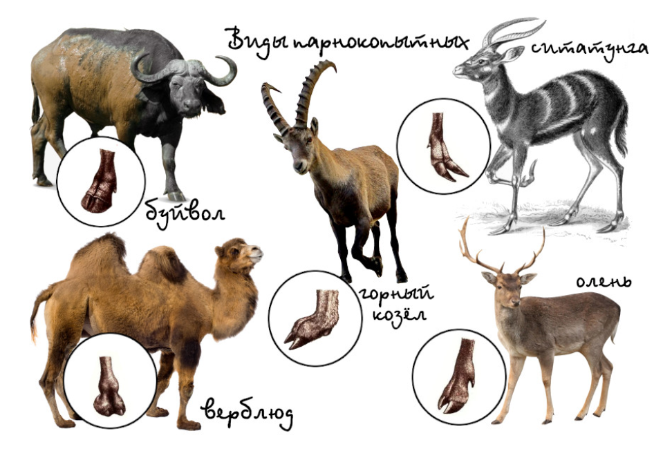 К парнокопытным относятся все те копытные, для которых характерно четное число пальцев на ногах, например олени и крупный рогатый скот, а ко вторым — наоборот, нечетное. Например лошади и носороги. Парнокопытные гораздо более многочисленные, нежели непарнокопытные, и насчитывают около 270 видов. Они делятся на жвачных и нежвачных. Жвачные — это травоядные животные с несколькими желудками, которые облегчают переваривание растительной пищи. У многих жвачных на лбу есть оружие, например рога или панты (незрелые рога — ещё растущие). Верблюды не относятся к жвачным животным, но имеют схожую пищеварительную систему. Не считая китообразных, это самый тяжелый из существующих сухопутных парнокопытных и самый крупный после слонов и носорогов. На каждой ноге у него по четыре пальца примерно одинакового размера, которые он использует как для ходьбы, так и для плавания. К непарнокопытным относятся животные, которые опираются на один или нечетное число пальцев на ногах: обычно на трети