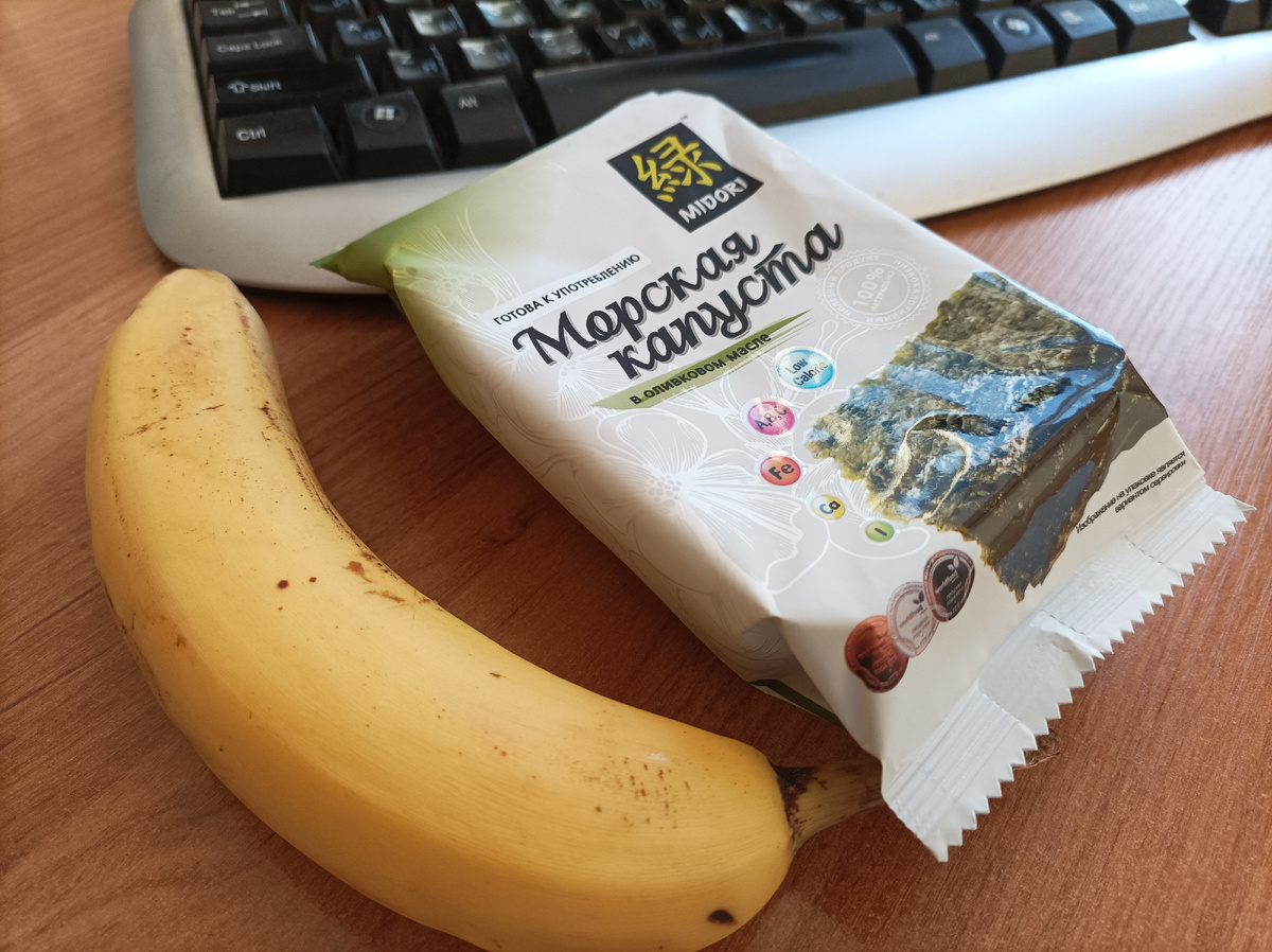Недавно в комментариях меня просили рассказать, что я беру с собой на работу на перекусы. Это именно перекусы, не обеды. Причём, перекусы недорогие. Завтрак у меня примерно в 7.40. Обед в 12.30. Соответственно, получается 5 часов между приёмами пищи. В 10 часов уже хочется чем-то заморить червячка. После обеда тоже иногда беру перекус с собой, если домой возвращаюсь в 18 часов. Если в отдельные дни знаю, что в 17 ч уже буду дома, то 4 часа без еды можно прожить. Это даже полезно. Как правило, на перекусы я чаще всего беру бананы. Они сытные и их удобно брать с собой. На фото выше сразу два лëгких перекуса - до обеда и после. Морскую капусту очень люблю. Она для меня как наркотик. 🙂 После такого перекуса и работоспособность повышается, потому что выстреливают гормоны радости. Иногда беру с собой йогурты. Но это совсем лёгкий перекус. Бананы сытнее. Бывает, что кто-то приносит на работу выпечку. Если я сама пеку пироги или печенье, то тоже беру с собой. Или только себе, или всех