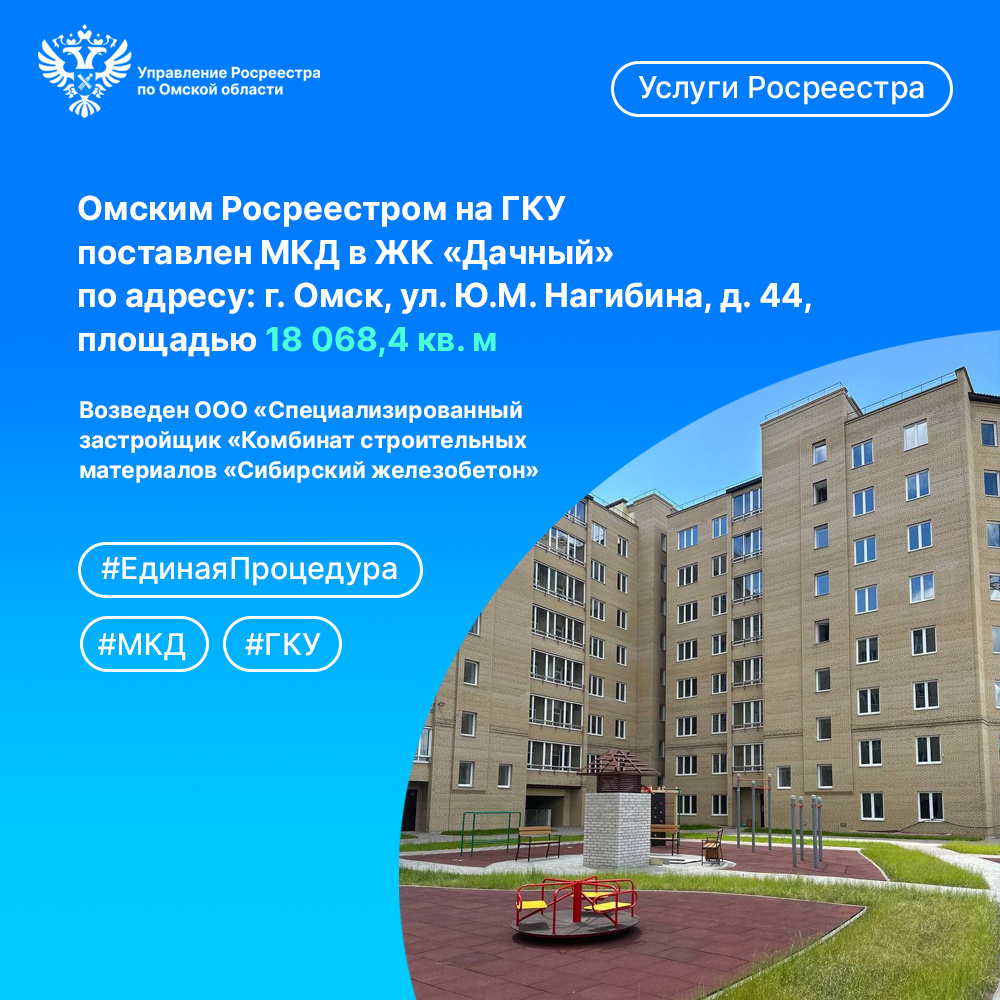 Управлением Росреестра по Омской области на государственный кадастровый учет поставлен многоквартирный дом, возведенный в Центральном административном округе по адресу: г. Омск, ул. Ю.М. Нагибина, д. 44., с одновременной регистрацией права на помещения. Разрешение на ввод объекта в эксплуатацию от департамента архитектуры и градостроительства Администрации города Омска получено 15 октября 2024 года, документы поданы в Росреестр 16 октября, 17 октября сведения об объекте были внесены в Единый государственный реестр недвижимости. Высотка возведена в жилом комплексе «Дачный» по улице 2-я Кольцевая Обществом с ограниченной ответственностью «Специализированный застройщик «Комбинат строительных материалов «Сибирский железобетон». Площадь 9-этажного МКД с одним подземным этажом составляет 18 068,4 кв. м. Высота МКД – 33,3 м. Площадь жилых помещений – 12 978,6 кв. м. В доме расположено 138 квартир: 14 – однокомнатных (их совокупная площадь – 816,2 кв. м), 51 – двухкомнатных (общая площадь – 4