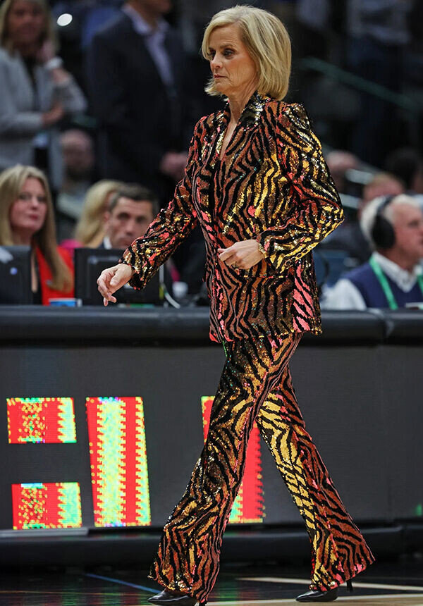 Ким Малки — легенда американского баскетбола. В юности спортсменка стала первой женщиной в истории национального студенческого спорта, которая выиграла чемпионский титул, а уже в 1984 году она стала олимпийской чемпионкой. Сегодня Ким успешный главный тренер женской баскетбольной команды университета штата Луизиана и настоящая модница — ее образы, в которых она появляется на матчах, вполне сгодились бы для красных дорожек. А ей, на секундочку, 62 года! Ким часто называют тигрицей, и не только потому, что она тренирует команду под названием «Леди Тайгерс», но и из-за ее любви к «диким» принтам. Например, на одном из матчей Малки появилась в акцентном брючном костюме, усыпанном сияющими пайетками, с анималистичной расцветкой. В таком точно не останешься незамеченной! Да, Ким любит экспериментировать и не засиживается в одном амплуа. На смену дерзком аутфиту тренер выбрала прямые белые брюки и нежно-розовый жакет с декоративными цветами на плечах. Дополнили сочетание лодочки на высоких