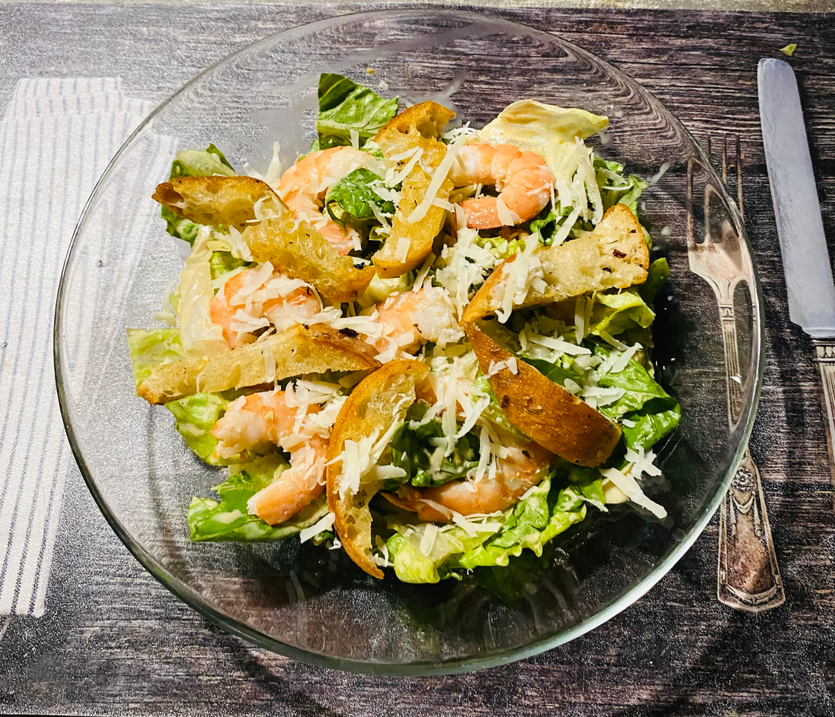 - Добавляем креветки и гренки.